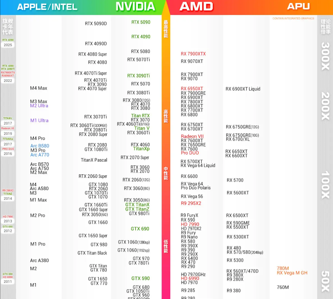 现在显卡已经出50系列了,看看就好,新卡肯定买不起。但从图中看出,标绿色或者红色字体的都是历年的旗舰卡。从底部开始看的话,我在2017年给同村好友配的电脑1050ti和1060现在也还在用呢。他们不玩大型单机,最多也就玩绝地求生,还是依旧流程够用。