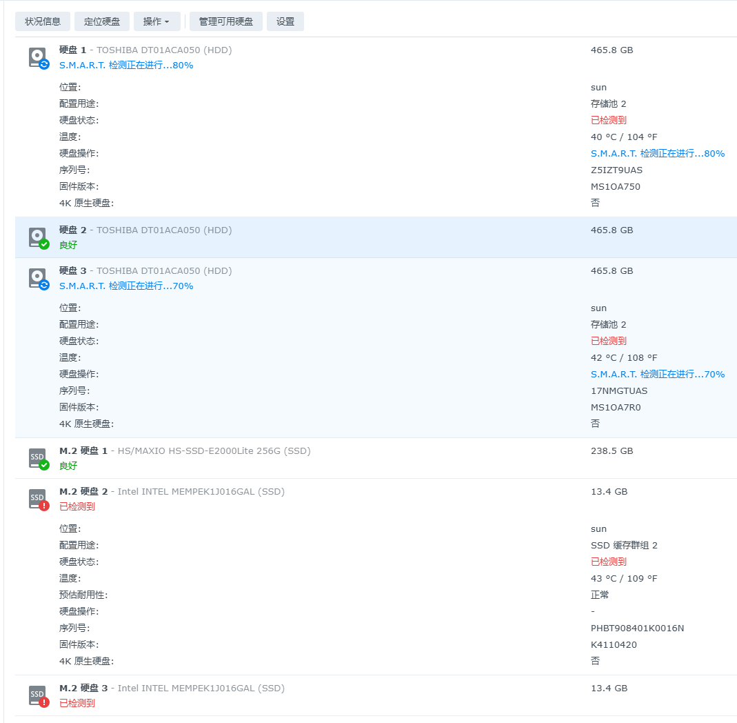 硬盘除了固态,其他都是机械硬盘都是淘宝上的二手硬盘。到手时用DiskGenius扫描是绿的,但使用过程中,有时会读不到盘,或者就是损毁。这我都不敢迁移数据,目前只是将备份数据放上去,测试测试。感觉浪费了很多时间,不大值得。